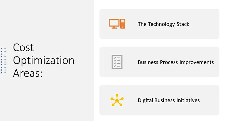 There are three areas of focus for cost optimization, including Information & Technology, which comprise data center, application management, application development, Infrastructure and application services, software, and SaaS; the second area is business process optimization, e.g., Advanced automation, intelligent services to cut costs and eliminate errors, and the third area is digital business initiatives, e.g., the implementation of an IoT platform, a blockchain proof of concept, data center modernization, offshore increase, agile sourcing, cloud, and SaaS migration. According to Gartner, digital business initiatives have the most significant potential impact when replacing outdated processes with digital processes spanning businesses, customers, and products.